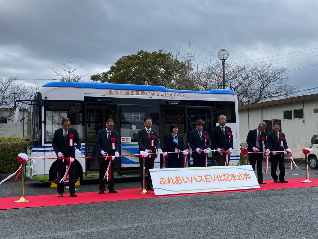 のディーゼルバスから、環境にやさしい EV バスに替わることを周知するため「ふれあいバス EV 化記念式典」が開催されました。